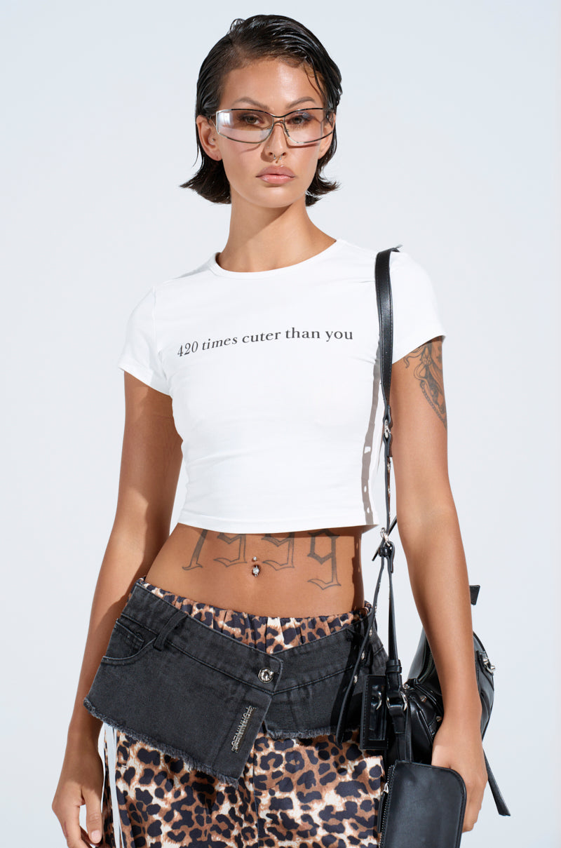 No lies here! The AKIRA Label 420 Times Cuter Than You Baby Tee is crafted from stretchy cotton and features a crew neckline. short sleeves. and a contrast ā420 times cuter than youā graphic across the chest. Complete with a snug. cropped silhouette. and a pull-on fit. Pair with low-rise jeans. chunky sneakers. and a metallic shoulder bag for a sassy. adorable finish.
