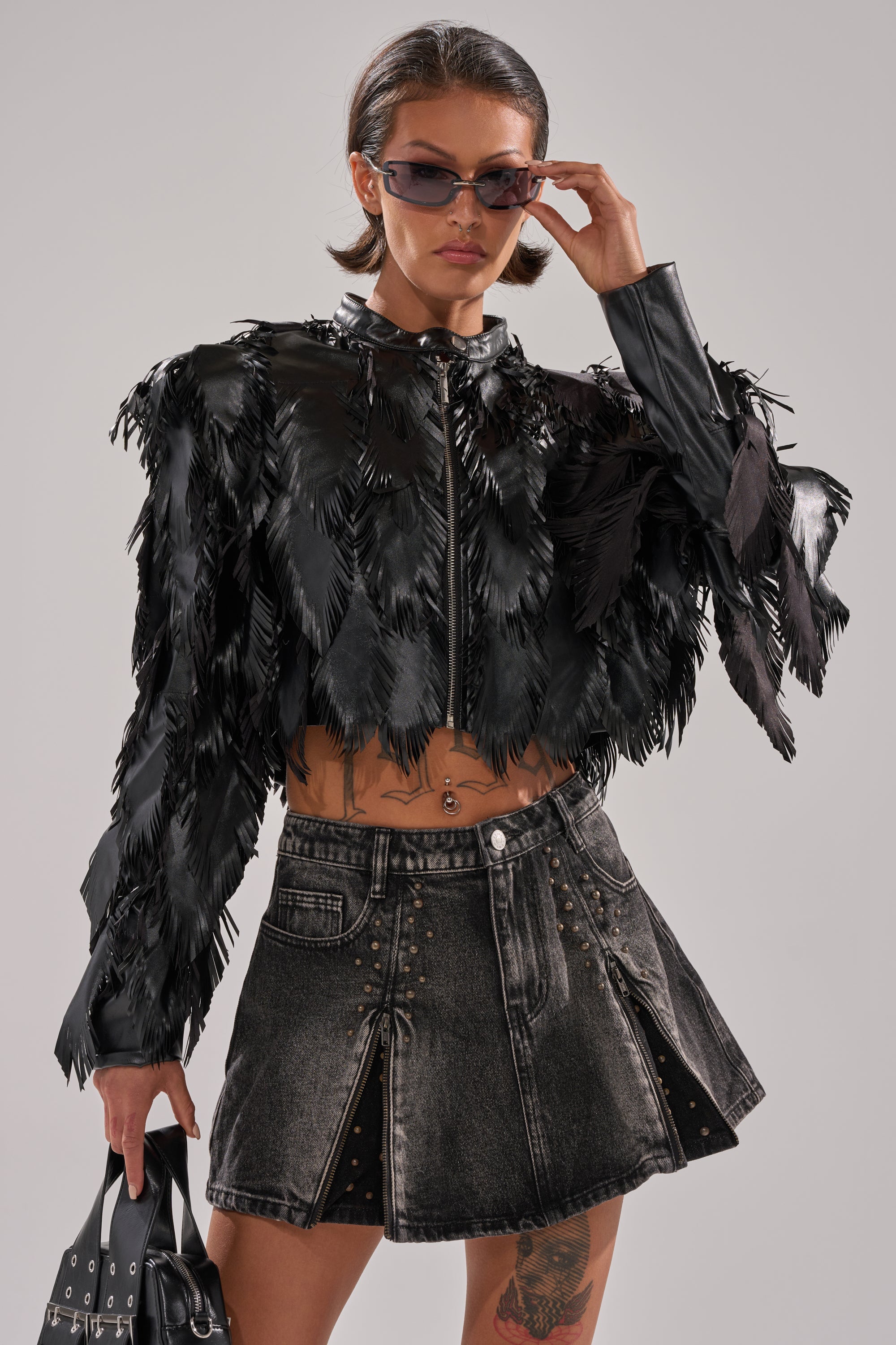The AWNIS Label Avant Garde Laser Cut Bomber is the best of the best. Crafted from sleek faux leather. this cropped jacket boasts a standing collar. lightly padded shoulders. long sleeves. a front zipper closure. and totally covered in layered. precision-cut panels that mimic feathered plumes. Complete with a boxy fit. Pair with a mini leather skirt. strappy stilettos. and a vampy lip for a finished look.
