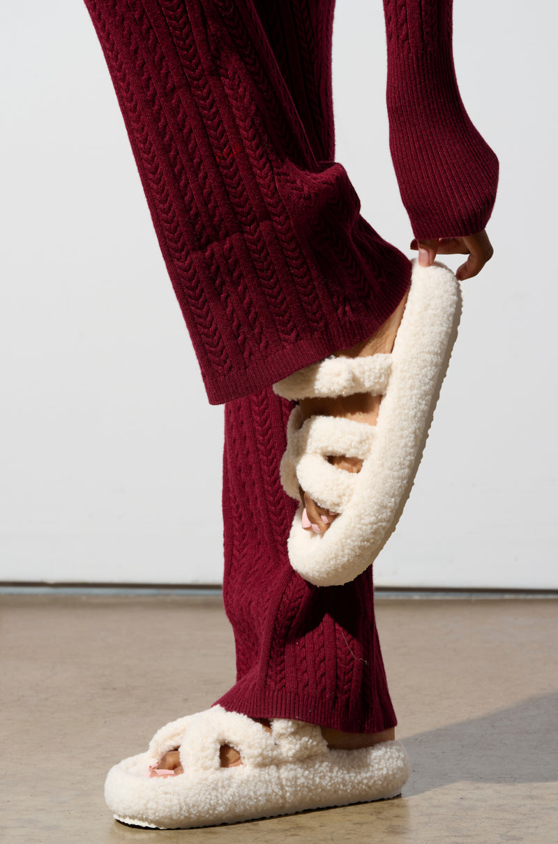 The perfect mix of cozy n' cute. The AZALEA WANG Honor White Sandal is crafted from a plush sherpa upper and features an open almond toe silhouette. a flat sole. a textured outsole. a wide geometric footband with side cut out detailing. and a coordinating adjustable velcro strap. Complete with a slip-on fit. Pair with joggers and a chunky knit sweater to lounge in style.