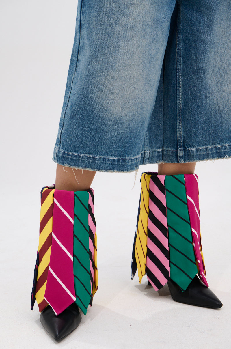 Redefine business casual with the AZALEA WANG Jaune Black Tie Bootie. This chic ankle boot is crafted from glossy faux leather and adorned with multi-colored. striped necktie-style appliques that dangle over the shaft. It features a pointed toe silhouette. a slim stiletto heel. and an effortless pull-on fit. Pair with anything from pencil skirts to trousers for a bold. one-of-a-kind menswear-inspired look