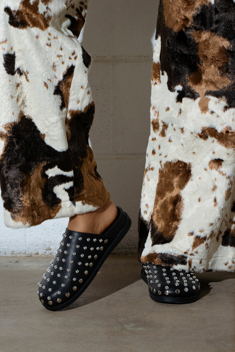 Cool and comfortable? Say less. The AZALEA WANG Traverse Black Clog features a faux leather upper. a round toe silhouette. a flat rubber sole. a Comfort Cushion insole. and an easy slip-on fit. Round. metallic silver studs embellish the upper for an edgy finish.
