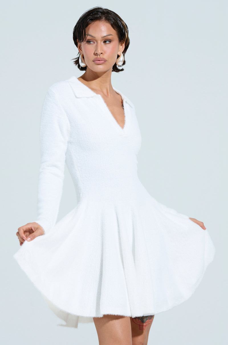 Cozy and cute? Sign us up. The AKIRA Label Cozy Girl Chic Fuzzy Mini Dress With Long Sleeves is crafted from a super soft. knit sweater fabrication and features a V-neckline with a fold-over collar. a fit and flare silhouette. long sleeves. and a pleated skirt design. Style it with tights and boots for the holidays.