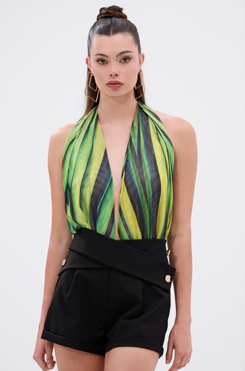 Go green with The AKIRA Label Deep In The Woods Bodysuit. Crafted from a semi-sheer. stretchy mesh fabrication. this eye-catching one-piece features a plunging halter neckline with a dual-button closure at the neck. a sexy open-back design. a snap-gusset closure. and a bold. abstract graphic print in lush shades of green throughout. Wear it with the coordinating Deep In The Woods Duster for a fresh 'fit.