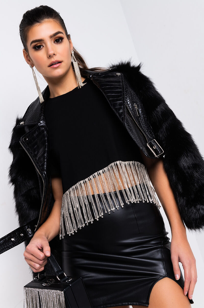 Your diamonds should be dripping. This AWNIS Label Diamond To Filth Shirt is made of a soft and stretchy cotton blend in black. Features rhinestone shingles that fall from the hem of the shirt and short sleeves. Wear with your favorite high waisted PU leather skirt in black to be a diamond-studded diva.