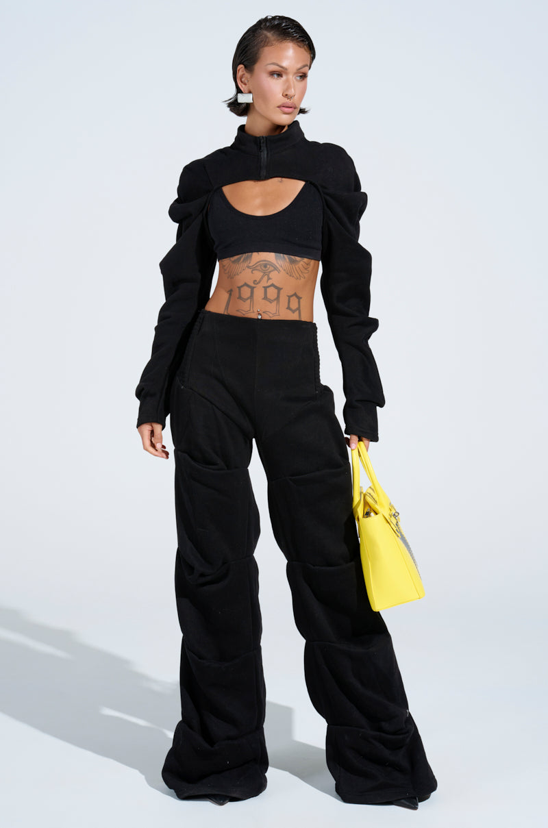 Let your style do the talking in The AWNIS Label Don't Mess With Me Stacked Jogger. These effortlessly cool bottoms are crafted from a slightly stretchy. soft cotton-blend fabrication and features a high-rise fit. a drop waist with a shirred elastic panel on the back. and paneled ruched detailing on both pant legs for an added touch of edge. They're complete with a wide leg silhouette. and an easy. pull-on fit. Style with the coordinating AWNIS Label Don't Mess With Me Crop Sweatshirt. a bralette. and platform sneakers for a finished look.
