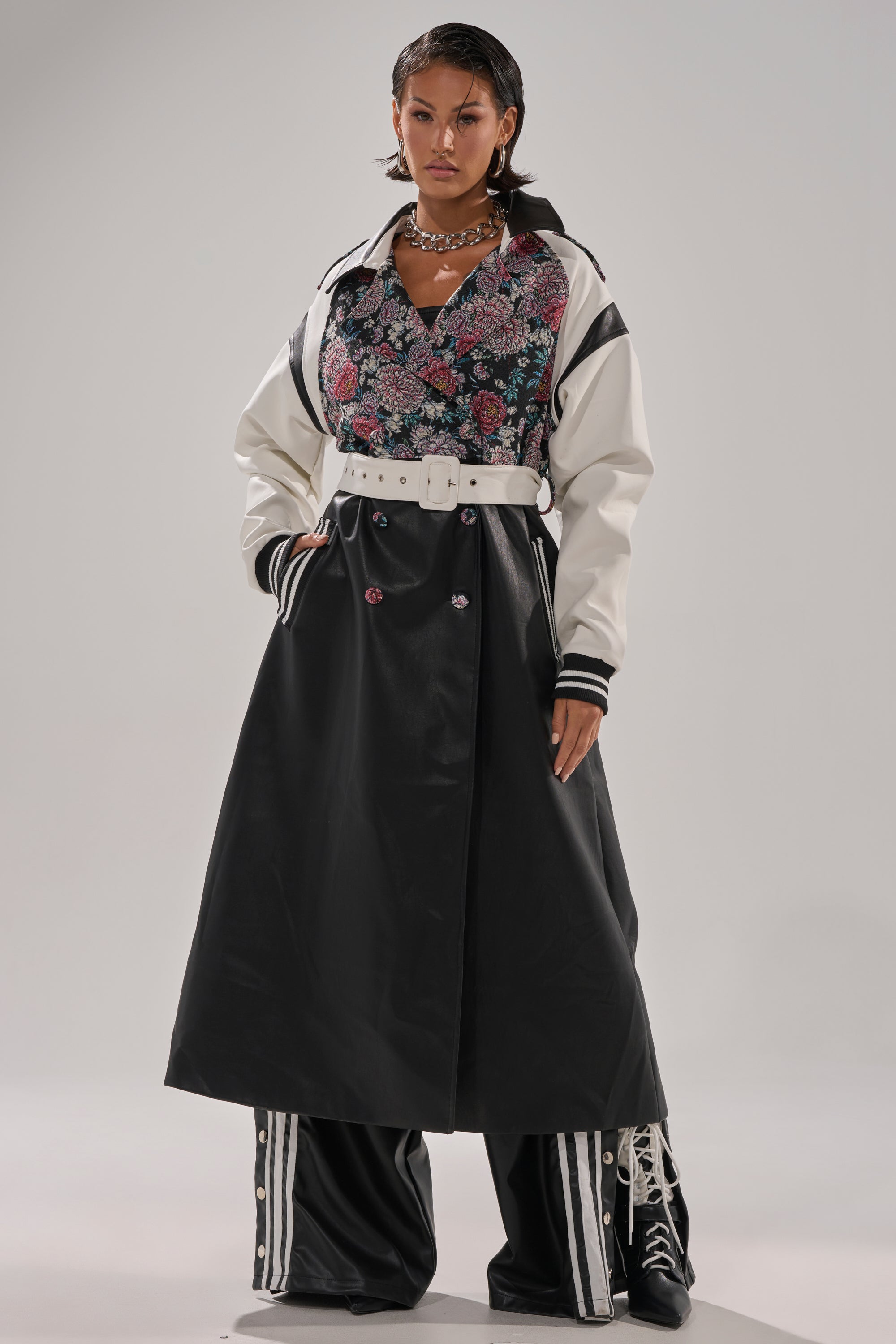 The AWNIS Label End Game Mixed Media Trench blends sporty edge with elevated sophistication. Designed with a floral jacquard bodice. faux leather skirt. and varsity-inspired striped cuffs. this coat delivers a statement-making contrast of textures. The piece features faux leather shoulder accents. floral-covered buttons. a wide belt to define the waist. and structured epaulets for a tailored touch. Finished with side slit pockets and a sleek. full-length silhouette. it's a bold reimagining of the classic trench.