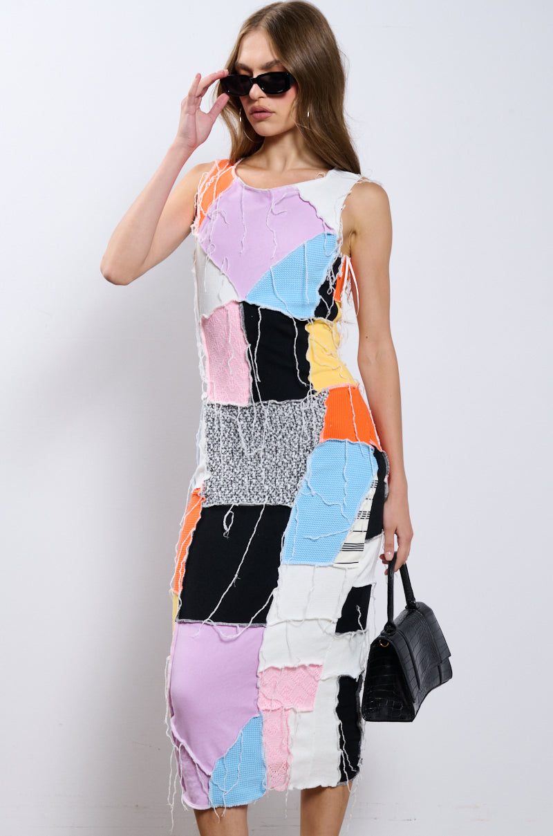Mix patterns. not feelings. Crafted from a soft and stretchy cotton blend. The AKIRA Label Esme Distressed Knit Midi Dress is an adorable tank dress featuring an all-over patchwork design made from a wide variety of textures. patterns. and vibrant colors. It's complete with lightly distressed detailing throughout and a curve-hugging. pull-on fit. Wear it with a pair of chunky sneakers and a cute tote bag and hit the farmers market in style.