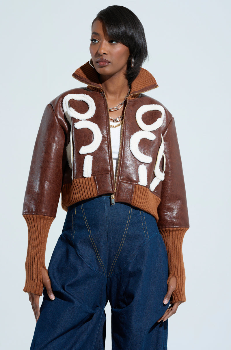 Ready to fight the cold in style with The AWNIS Label Giulia Sherpa Trim Bomber. This stylish outerwear piece is crafted from a luxuriously smooth. textured faux leather base and features a ribbed knit fold-over pointed collar. long sleeves with extended ribbed knit cuffs and thumbholes. a coordinating elasticized ribbed waistband. a faux metallic gold front zipper closure. and abstract. swirled faux sherpa detailing on the front panels. Complete with a cozy faux sherpa inner lining. and a boxy. cropped silhouette. Pair with straight leg denim. stiletto booties. and furry earmuffs for a finished look.