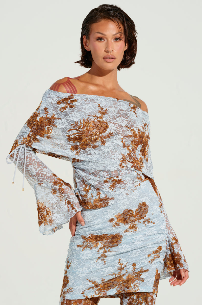 You are everybody's fantasy in The AKIRA Label Giving You Something To Dream About Top. This chic style is brought to you in a stretchy. double-lined floral lace fabrication and features contrast floral accents throughout. an off-the-shoulder silhouette with a fold-over shoulder panel with adjustable drawstring closures on one side. long flared sleeves. and an asymmetrical bottom hemline. Complete with a cropped fit. and an easy. pull-on design. Pair with the coordinating AKIRA Label Giving You Something To Dream About Pant and platform booties for a dreamy ensemble.