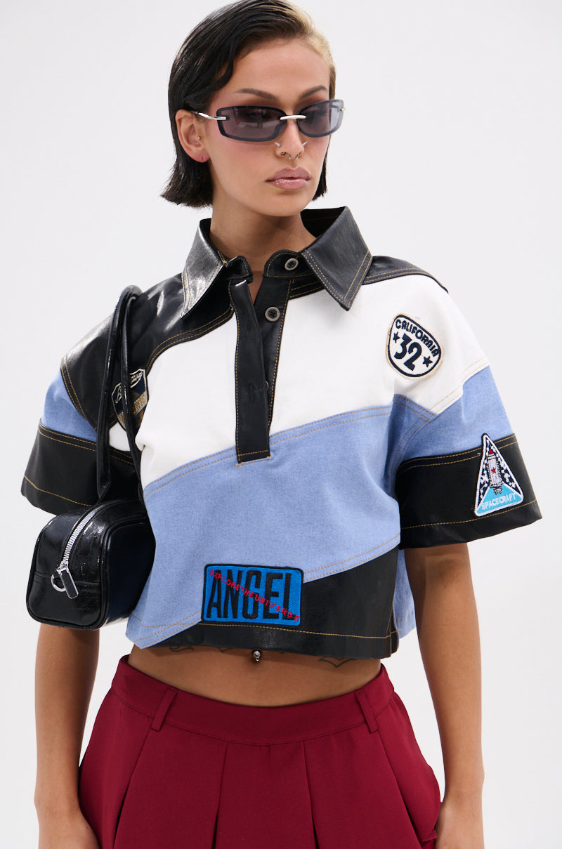 The AWNIS Label Guess What Stripe Collared Blouse brings a bold. edgy statement to your wardrobe. This cropped collared top features a unique colorblock design with faux leather accents and sporty patchwork details. including embroidered patches and badges across the front and sleeves. With its structured silhouette and snap button closure at the neckline. this piece delivers a mix of streetwear attitude and playful charm. Perfect for pairing with cargo pants. denim. or layered over a mesh top for a standout look.