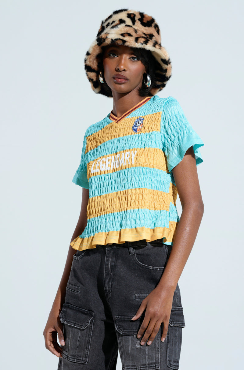 MVP alert! Ball like a baddie in The AKIRA Label I Am A Legend Jersey. This playful piece is crafted from a super stretchy jersey fabrication and features a flattering seersucker design throughout. a V-neckline. short. ruffled sleeves. and a ruffled hemline. Two-tone. rugby-style stripes and soccer-inspired graphics make this top a total winner.