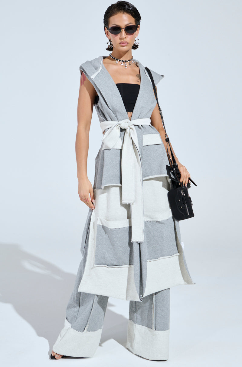 Have your moment in The AWNIS Label I'm Up Next Duster. Made from soft cotton. this effortlessly chic piece features a two-tone design and a high-low silhouette with extended front hems and a cropped back. The plunging neckline. sleeveless cut with slightly flared shoulders. and rows of spacious pockets along the front hems give it a standout look. Complete with a self-tie waist belt and an open front. this duster is a must-have. Style it with the coordinating AWNIS Label I'm Up Next Trouser. a sleek bandeau. and kitten heels for a head-turning finish.