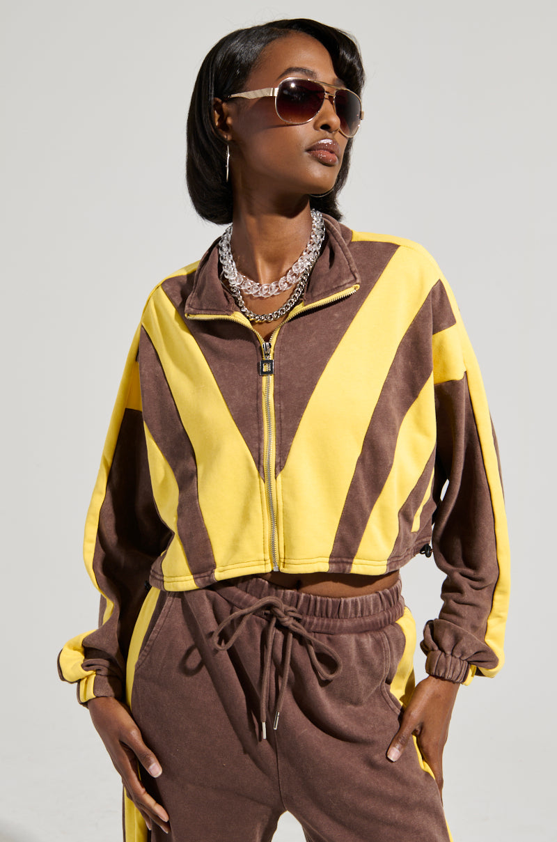 Dreams do come true in The AWNIS Label In Another Life Crop Sweatshirt. This casual-chic top is crafted from a stretchy. cotton blend knit base and features bold striped color block paneling. a mock neckline. long sleeves with cinched cuffs. and a bungee cord waistband. Complete with tonal stitching. a faux silver metallic front zipper closure with square hardware. and a boxy. cropped silhouette. Pair with the coordinating AWNIS Label In Another Life Wide Leg Pant and sneakers for a finished look.