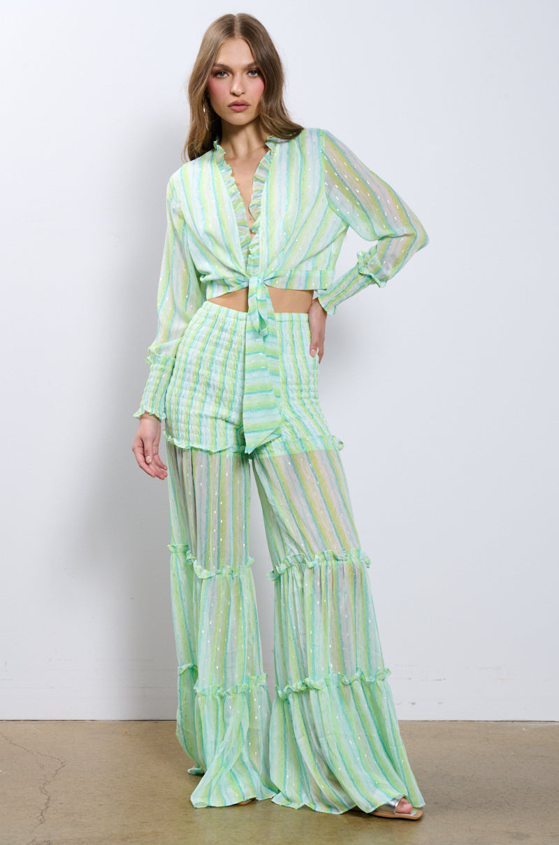 Stay easy and breezy in The AWNIS Label In The Wind Set. This set contains a coordinating top and bottom. which are crafted from a non-stretch. sheer chiffon-inspired fabrication with a bright. striped patterning and metallic detailing. The blouse features a plunging neckline with a tie-front closure. ruffled trim. long sleeves with ruched cuffs. a sleek inner lining in the bust. a pull-on fit. and a cropped length. The pants feature an unlined. high rise design. an extended. elastic ruched waistband. tiered ruffle detailing. a pull-on fit. and a wide leg silhouette. Pair together or separately for an effortlessly windswept ensemble.