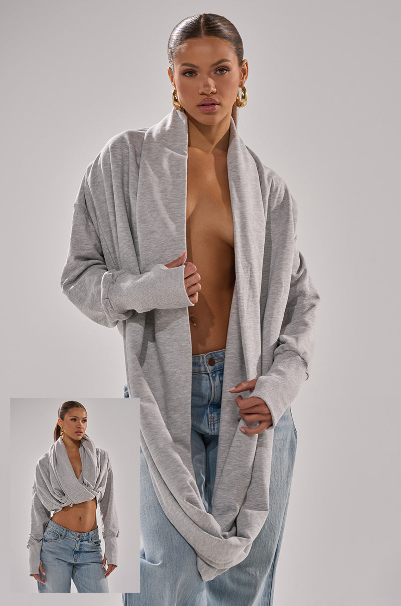 Not like a regular sweatshirt. but a cool sweatshirt. The AKIRA Label Just Too Cool For You Sweatshirt redefines basics with its dramatic. draped silhouette. Crafted in soft heather grey fleece. it features an open-front design with an elongated. scarf-like cowl neck that hangs almost to the knees. giving it a flowing. layered effect. The back is cropped at the waist with a ribbed hem that contrasts the loose fit of the body. while dropped shoulders and relaxed sleeves add to its laid-back vibe. A high. shawl-style collar frames the neckline. making it perfect for layering over tanks. tees. or slim knits.