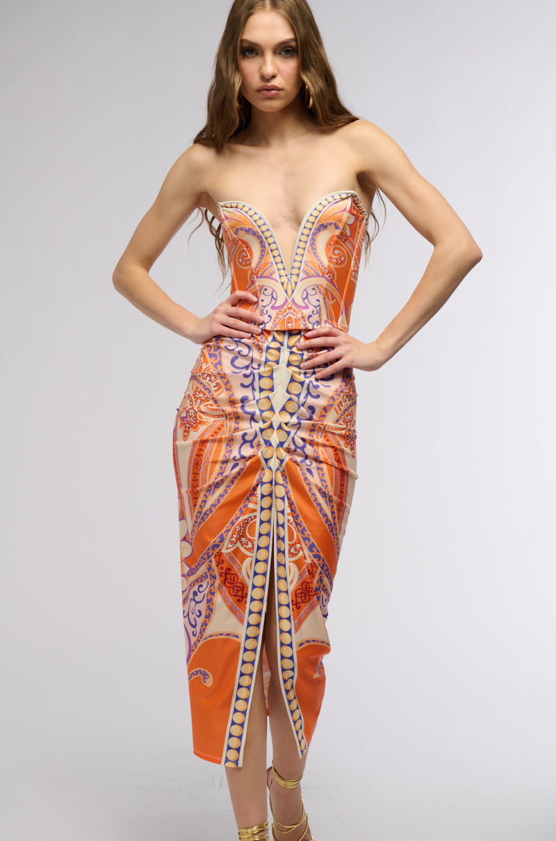 The AWNIS Label Meet At Sunset Corset And Midi Skirt Matching Set is a vibrant two-piece number featuring a slick and stretchy fabrication. a vintage-inspired print. and a strapless corset top with inner elastic trim. a plunging neckline. internal structural boning. a cropped silhouette. and a faux gold metallic back zip closure. Complete with a coordinating bodycon midi skirt. showcasing an elasticized dip front waistband. a high rise design. ruched front detailing with a large frontal slit at the hemline. and a pull-on fit.