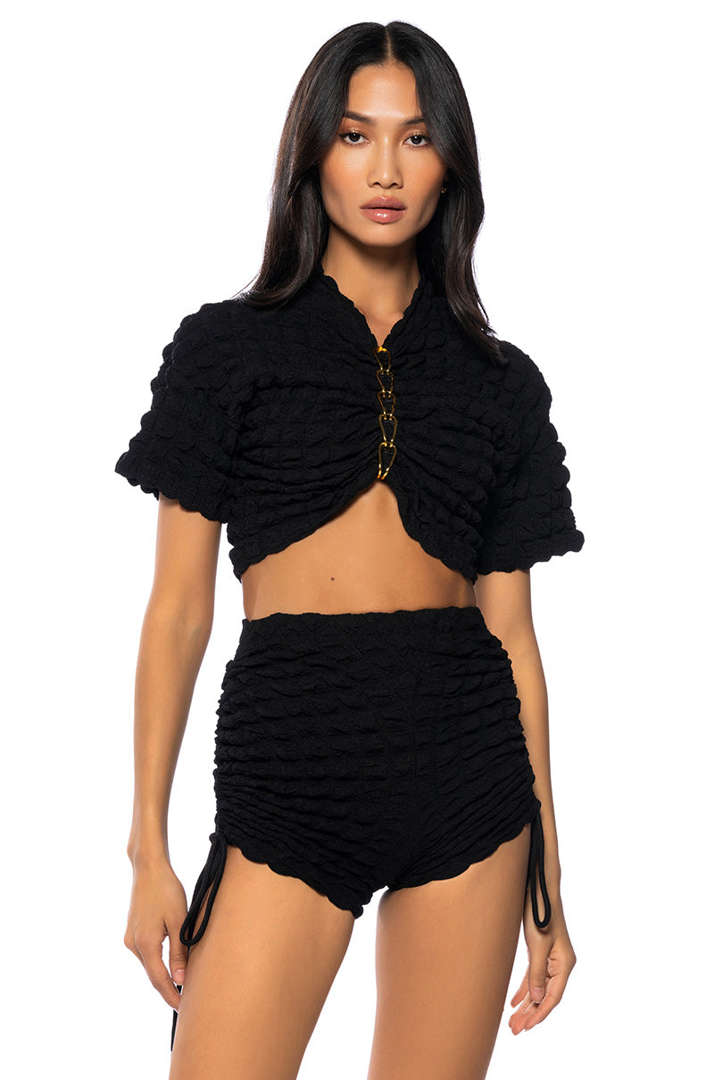 The AKIRA Label My Happy Place Textured Crop Top And Shorts Set is made from a stretchy. unlined popcorn texture fabrication and features: a V neckline. shorts sleeves. gold metal ring link front detailing. and a cropped silhouette. Complete with coordinating high rise shorts featuring a wide. elastic waistband. drawstring side detailing. and a pull-on fit.