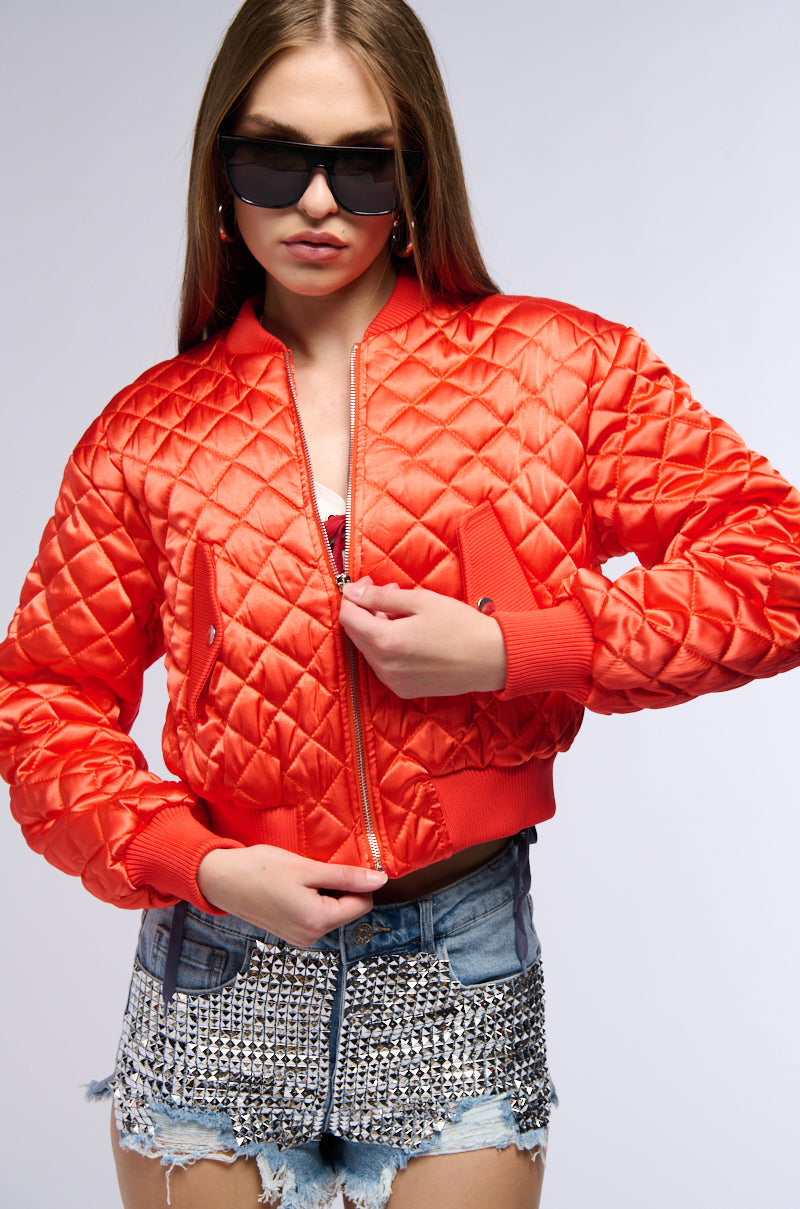 Embrace the new season in style with The AWNIS Label Never Better Quilted Satin Bomber In Red. This chic outerwear piece features a quilted satin base. a ribbed knit standing collar. long sleeves. elasticized ribbed knit hems. and a faux silver metallic zip front closure. Complete with a smooth inner lining. snap button flap front pockets. and a cropped silhouette. Style all season long with light wash denim bottoms.