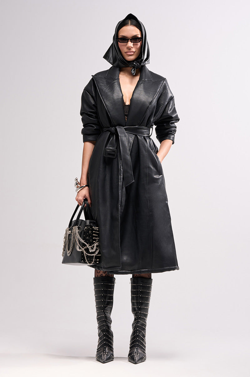 The AWNIS Label Puff Puff Pass Trench is crafted from buttery smooth. lightly padded faux leather and features an oversized notched lapel collar. drop shoulders. long sleeves. welted waist pockets. a matching self-tie belt and buckle that cinches the waist. and a relaxed. straight-cut silhouette. Complete with a lavish. longline length. Perfect for layering over dresses and business casual ensembles for the perfect finishing touch.