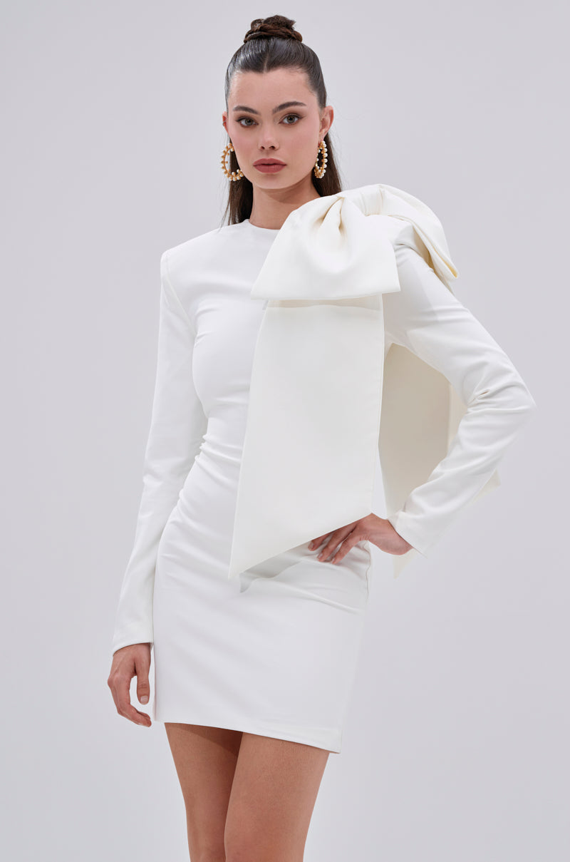 Give yourself the gift of style with The AKIRA Label Put A Bow On It Mini Dress. This understated stunner boasts a sleek. curve-skimming bodice. a high neckline. long sleeves. padded shoulders. and a tonal. oversized bow applique at the left shoulder that adds a dash of drama and feminine flair. Complete with smooth interior lining and a zip-back closure.