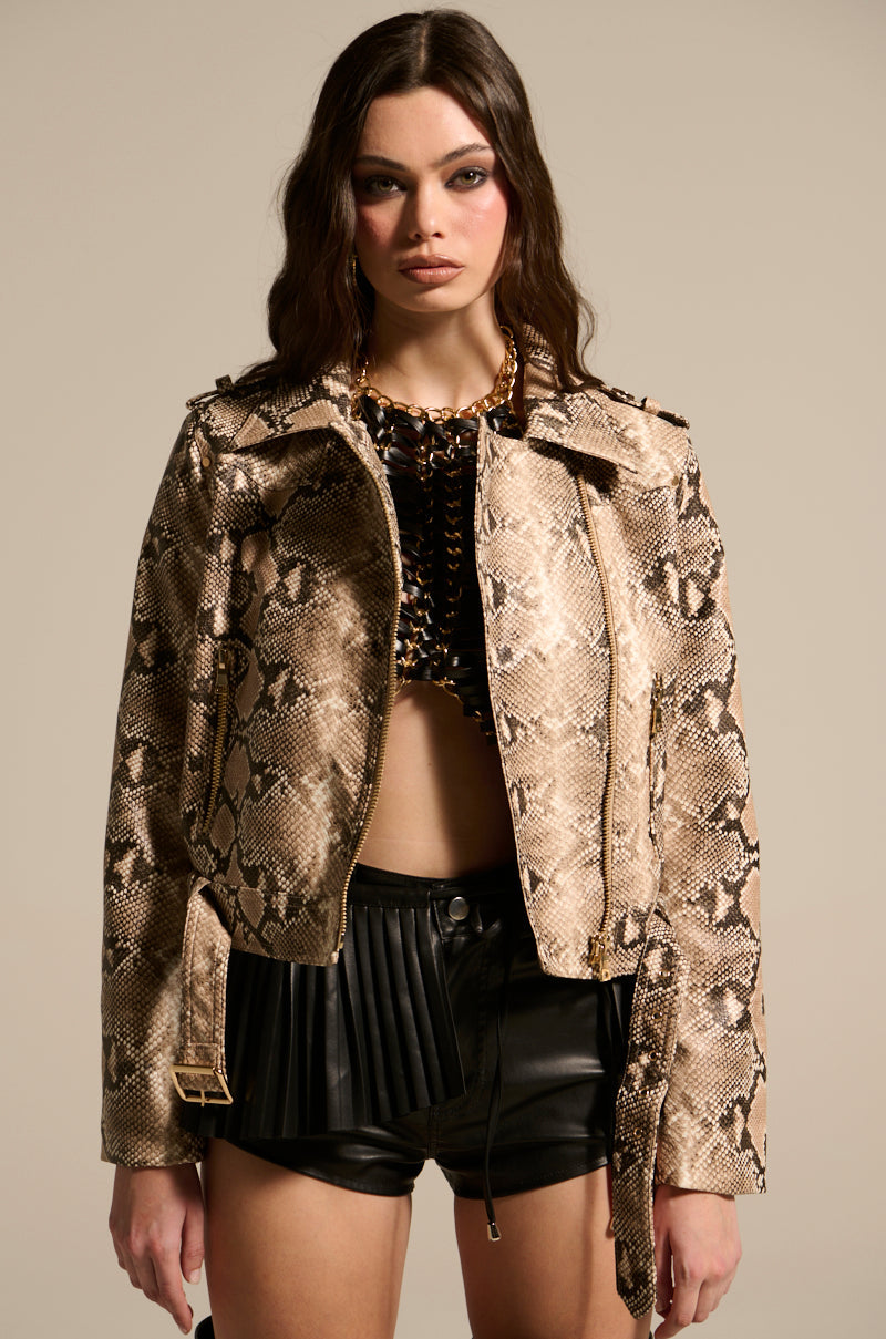 Built to bite back in The AWNIS Label Reboot Snake Moto. Crafted from slick faux leather. this sultry jacket features an embossed snakeskin print. a pointed collar. shoulder epaulettes. long sleeves with faux gold metallic zipper accents at the cuffs. dual zipper waist pockets. an asymmetrical front zip closure. and an adjustable buckled belt at the bottom hemline. Complete with a sleek inner lining. and a boxy. slightly cropped silhouette. Style with a corset. mini leather shorts. and knee-high stiletto boots for a finished look.