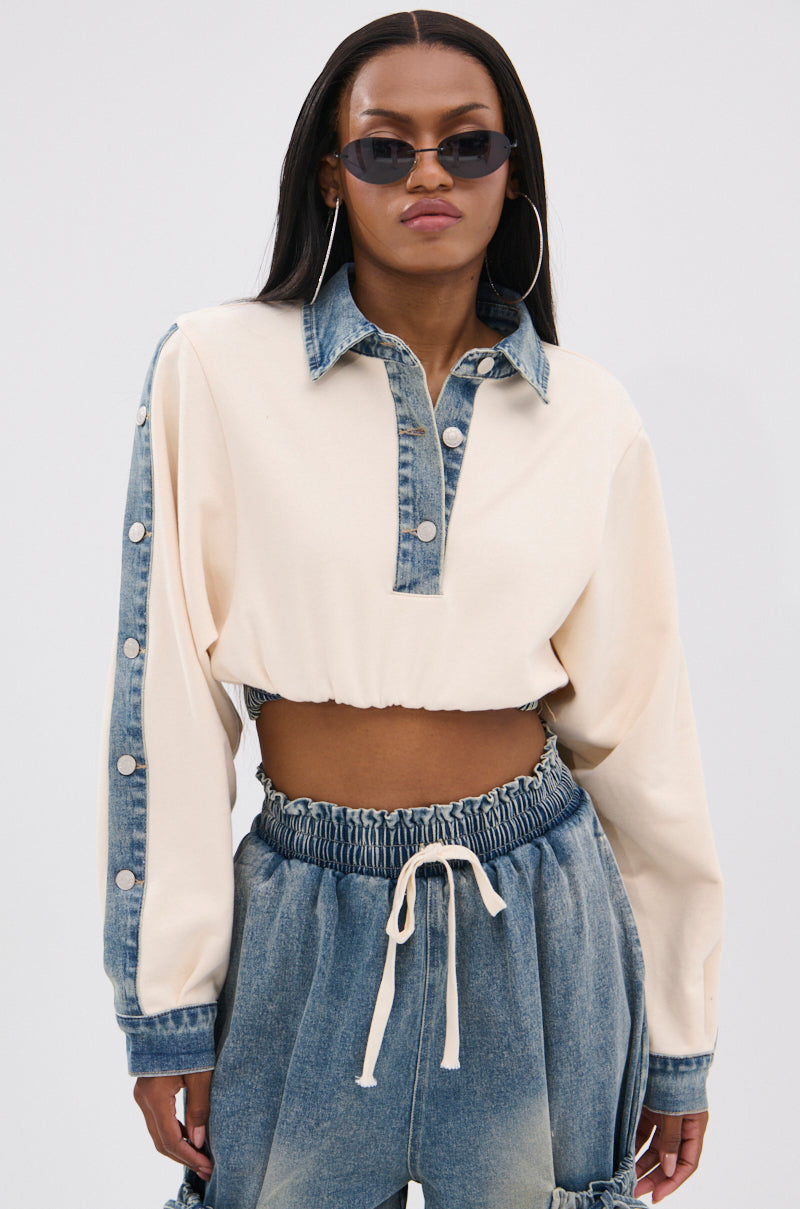 The AWNIS Label Relax With Me Sweatshirt is your new go-to for cozy-cool styling. This cropped pullover is crafted from a soft. cotton fabrication and features a contrast denim collar. button placket. and denim-trimmed hemlines. including denim stripes running down the long sleeves with silver metallic button detailing. Complete with a cropped silhouette. and an easy pull-on fit. Try pairing with the matching AWNIS Label Relax With Me Jogger. chunky loafers. and frilly ankle socks for a finished look.