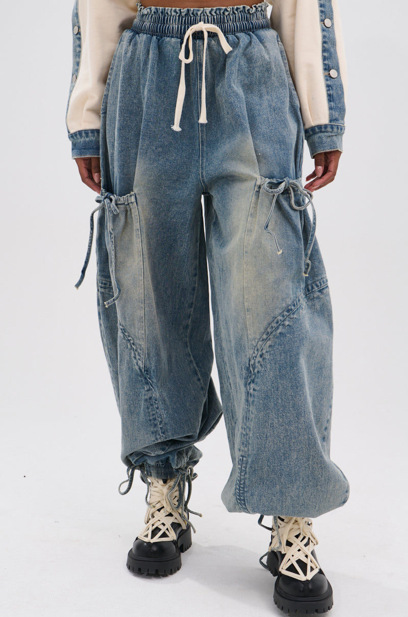 The AWNIS Label Relax With Me Jogger is crafted from soft. vintage-washed denim and features a high-rise fit. a shirred elastic waistband with drawstring closures. dual waist pockets and rear pockets. additional oversized pouches with ribbon detailing on the lower thighs. a unique paneled construction. and elasticized pant cuffs with coordinating denim self-tie accents. Complete with a relaxed. roomy silhouette. Try pairing with the coordinating AWNIS Label Relax With Me Sweatshirt. platform loafers. and mini sunnies for an effortlessly casual finish.