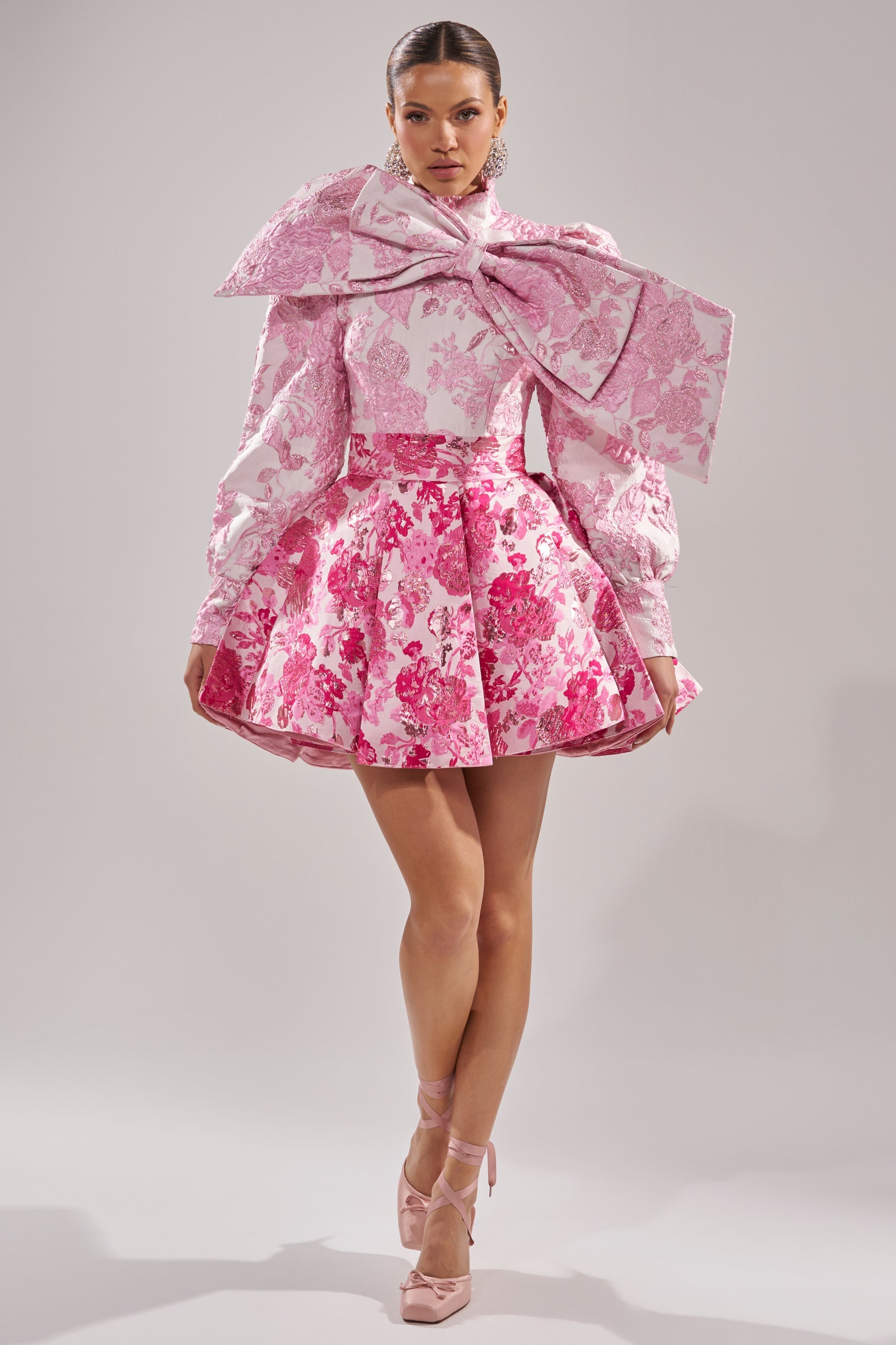 Live like royalty in The AWNIS Label Renaissance Two-Tone Brocade Mini Dress in Pink. A maximalist's dream. this mini dress is crafted from two coordinating floral jacquards that blend soft blush tones with saturated rose and magenta hues. The high neckline is crowned with an oversized sculptural bow that adds ultra-feminine flair. while voluminous puff sleeves add regal drama. A structured waist gives way to a full. pleated mini skirt that flares out with statement volume. Finished with a hidden back zipper and satin lining. this dress delivers both visual impact and couture-inspired detail.