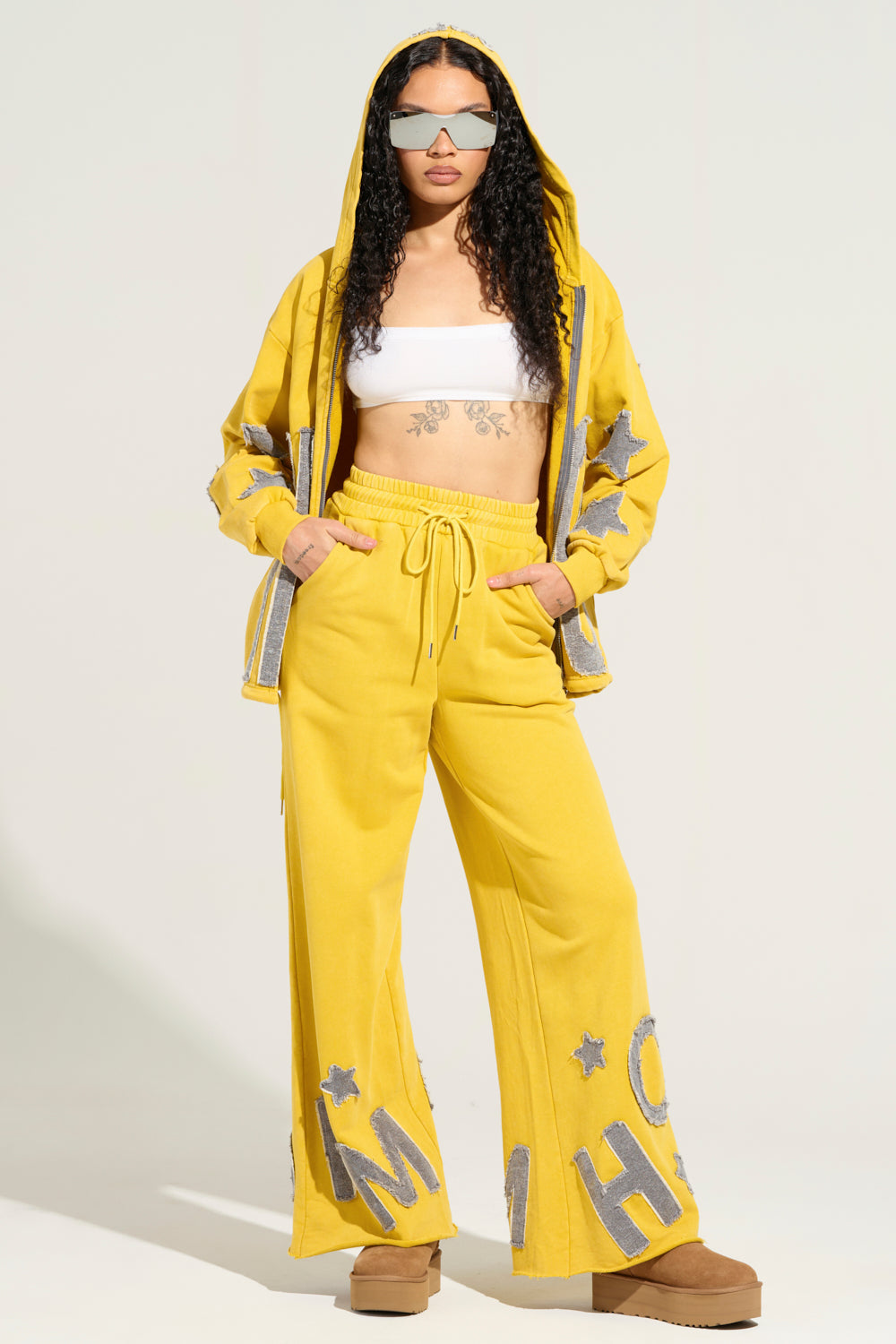 Always be the main event in The AWNIS Label Tell Her About Me Jogger. This comfy cozy bottom is crafted from a stretchy. cotton blend knit base and features a high rise design. a shirred elastic waistband. drawstring closures. side slant front pockets. tonal stitching. and embroidered contrasting letters and stars at the bottom hems. Pair with the matching AWNIS Label Tell Her About Me Hoodie and furry booties for a finished look.