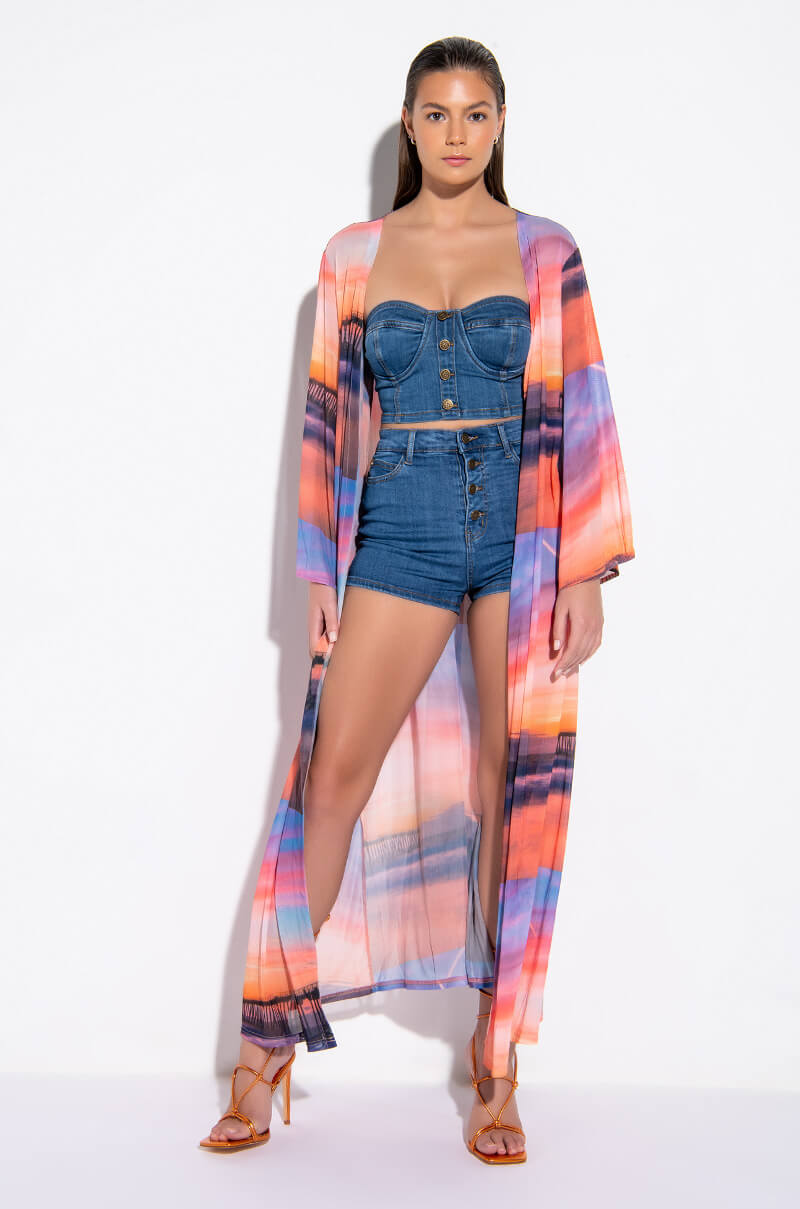 The AWNIS Label Temperature Is High Mesh Duster is a sheer mesh layering piece featuring a sunset print fabrication depicting a picturesque dock in the distance. This long sleeve piece features cinched elastic wrists. an open front. and a maxi length silhouette. Pair this duster with casual or dressed up looks alike to add some color to your look.