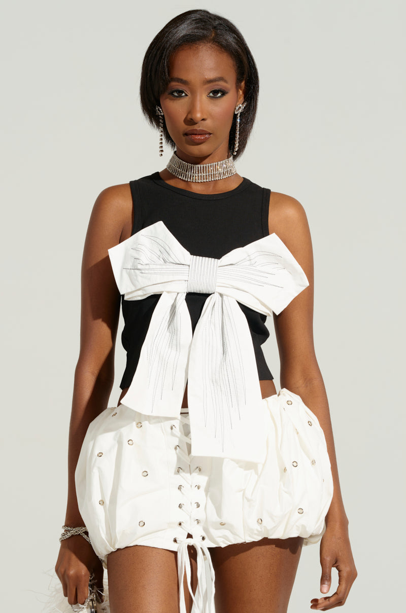 The bigger the bow. the better. The AKIRA Label The Best Bow Tank is brought to you in a stretchy. ribbed knit cotton blend base and features a crew neckline. thick tank straps. a raw bottom hem. a cropped silhouette. and a pull-on fit. Complete with a contrast oversized bow applique on the chest that cascades past the bottom hem. decorated with contrast stitching. Style with a leather midi skirt and pumps for a finished look.