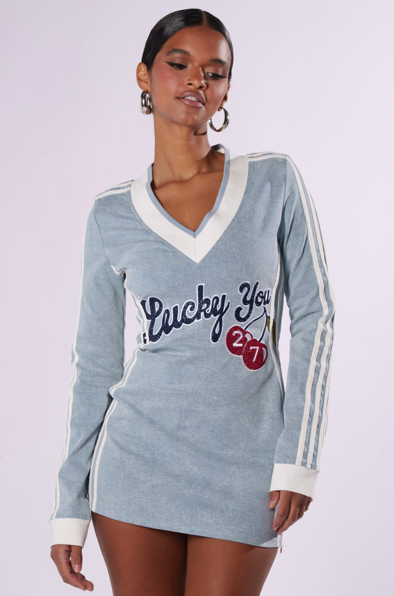 Let the world know you're a wild girl in The AKIRA Label With A Cherry On Top Denim Mini Dress. This playful piece is crafted from a light wash denim fabrication and features long sleeves with ribbed knit cuffs. a plunging v-neckline with ribbed knit contrast detailing. a rhinestone-embellished āLucky Youā front graphic. and a varsity-inspired. rhinestone āCHERRYBOMB #27ā back graphic. It's complete with sporty stripes and a tonal side zip closure.