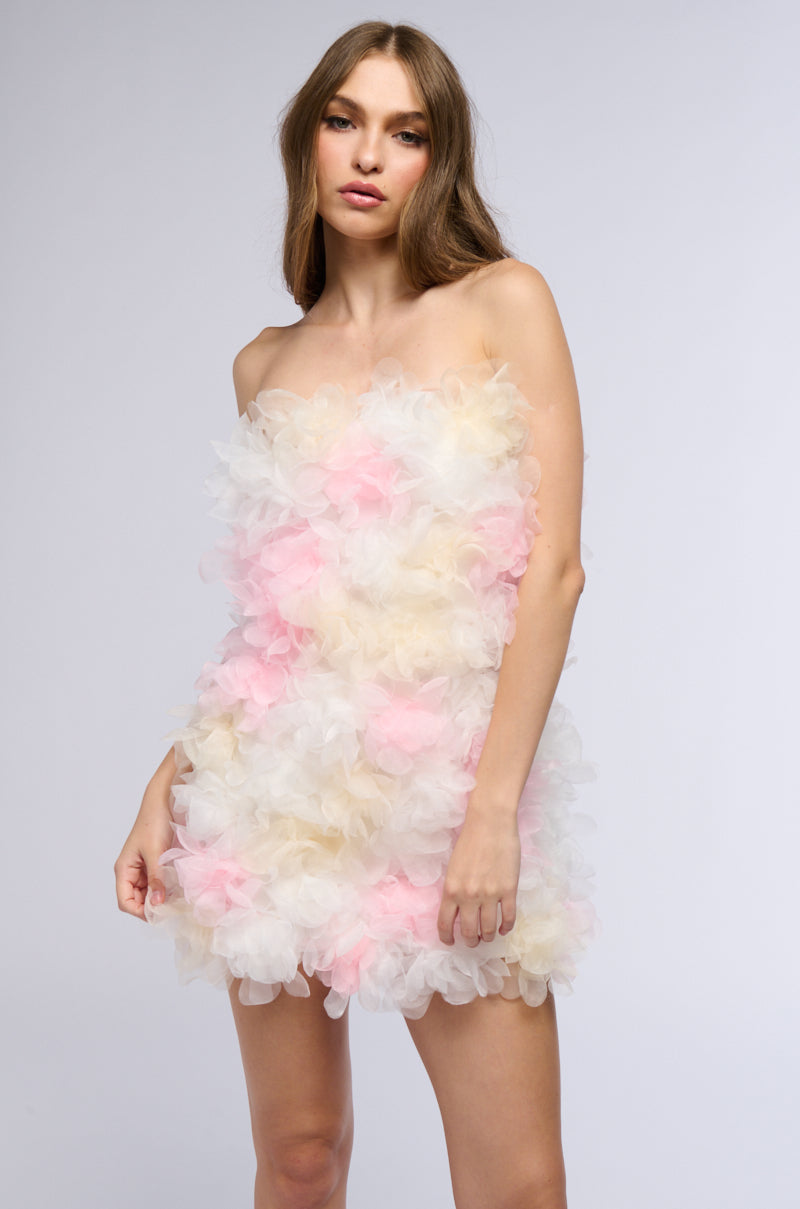 Be the bell of the ball in the AKIRA Label You Wish Floral Mini Dress! This precious piece features a fitted. super-stretchy bodice adorned with all-over floral appliques. a strapless silhouette. and a concealed back zipper. Complete the look with a pair of platform sandals and a cute clutch.